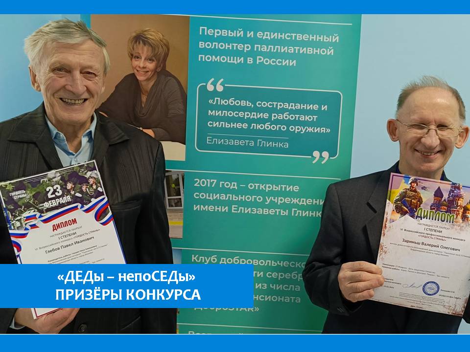 Жители пансионата - Валерий Зариньш и Павел Глебов, приняли участие в VI всероссийском конкурсе «Гордость страны» и стали лауреатами 1 степени в конкурсе к Дню защитника Отечества. На конкурс была представлена песня Б.Ласкина и братьев Покрасс «Три танкиста». Таким образом, мужчины участники проекта #ДЕДы – непоСЕДЫ реализуют свой личностный потенциал и сохраняют активное долголетие через творчество.