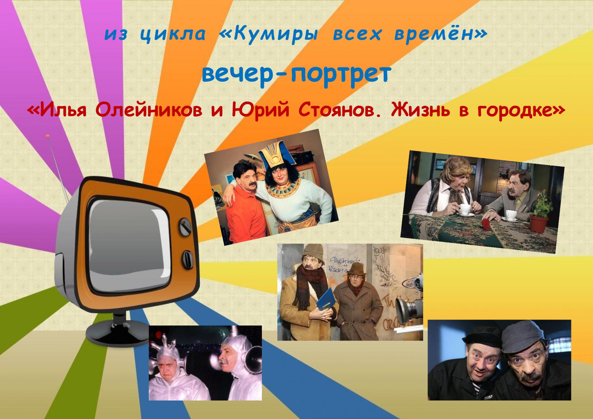Людям всегда было интересно знать о судьбах известных людей, об их деятельности и личной жизни. А что касается актёров, то это вдвойне. Таких биографических телепередач сейчас очень много и много газетных материалов, где можно узнать разные подробности. А жители Вязниковского Пансионата узнают о своих кумирах из мероприятий цикла «Кумиры всех времён». Героями очередного выпуска стали Народные артисты Илья Олейников и Юрий Стоянов. На протяжении 20 лет они радовали зрителя юмористическими номерами и постановками в телевизионной передаче «Городок». Это одна из любимых программ в те годы, которую жители страны с нетерпением ждали.