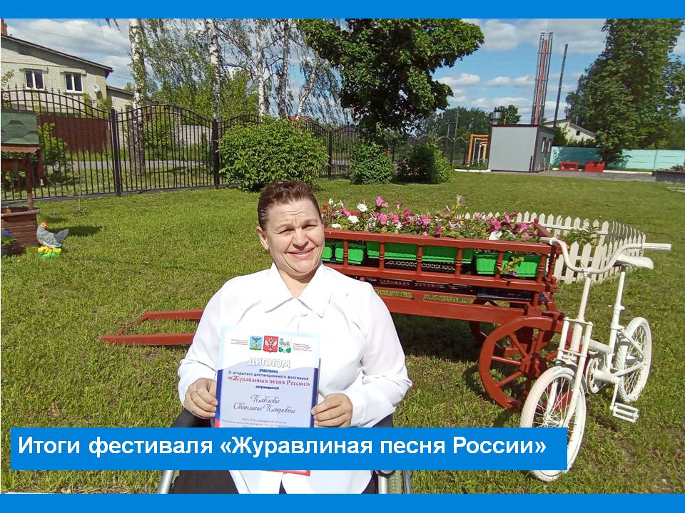 По итогам фестиваля «Журавлиная песня России дипломами отмечены жители пансионата Светлана Павлова, Наталья Идрисова и Павел Глебов.