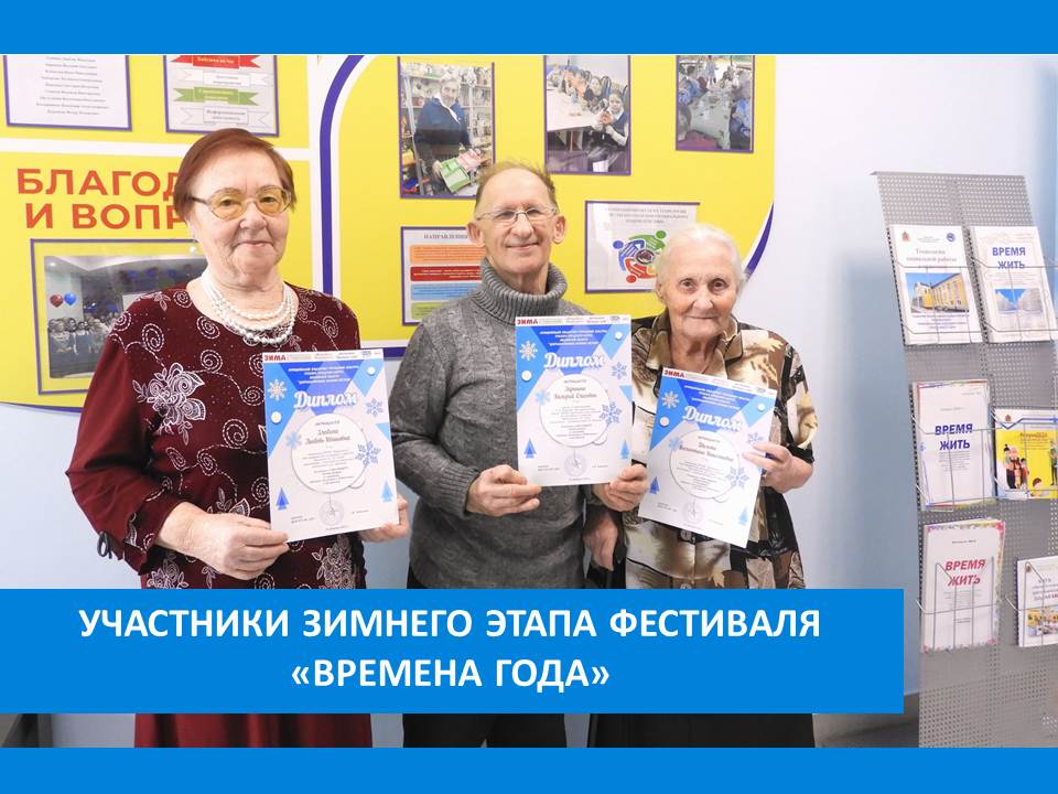 Сетевой фестиваль «Времена года», который проходит в рамках программы «Активное долголетие» завершился зимним творческим этапом «Снежная феерия». Жители Вязниковского Пансионата – Шилова Валентина Николаевна, Злобина Любовь Ивановна и Зариньш Валерий Олегович награждены дипломами. Молодцы!